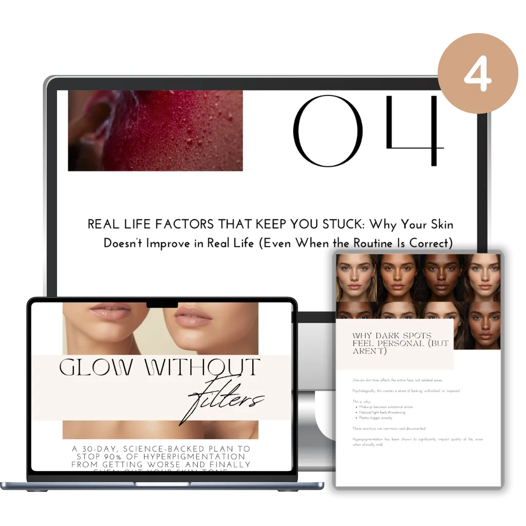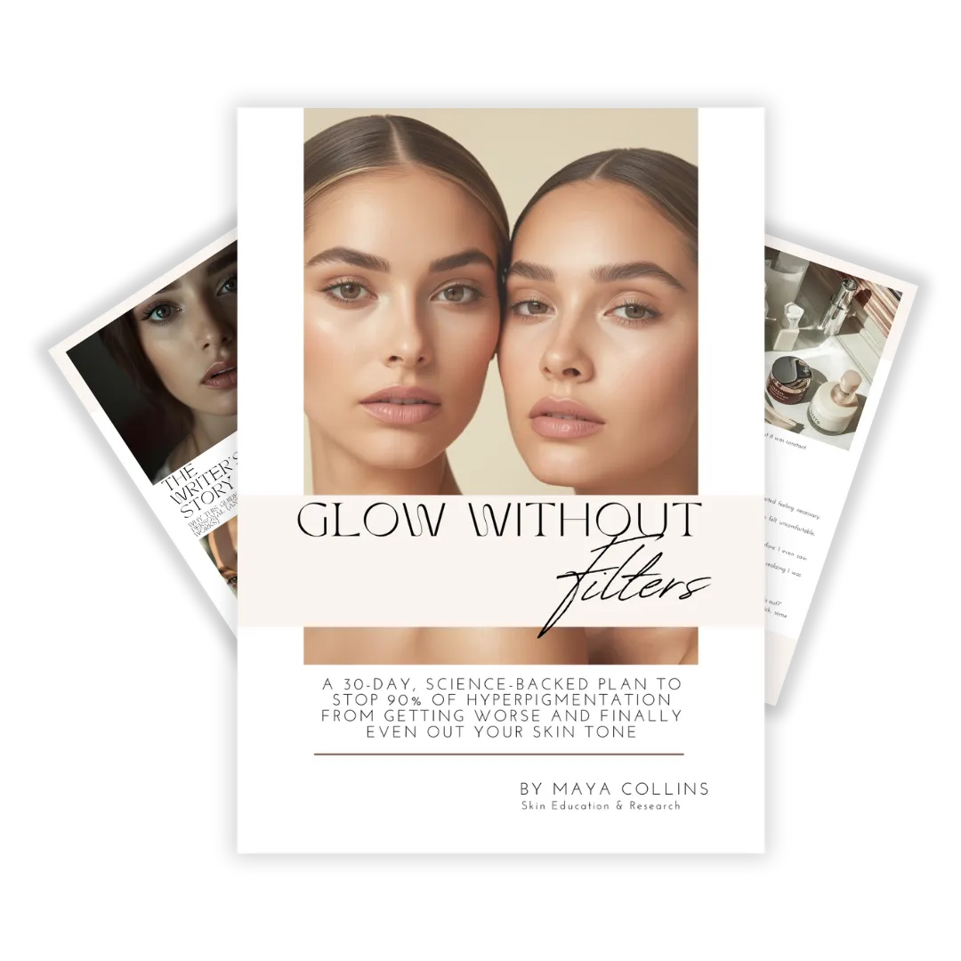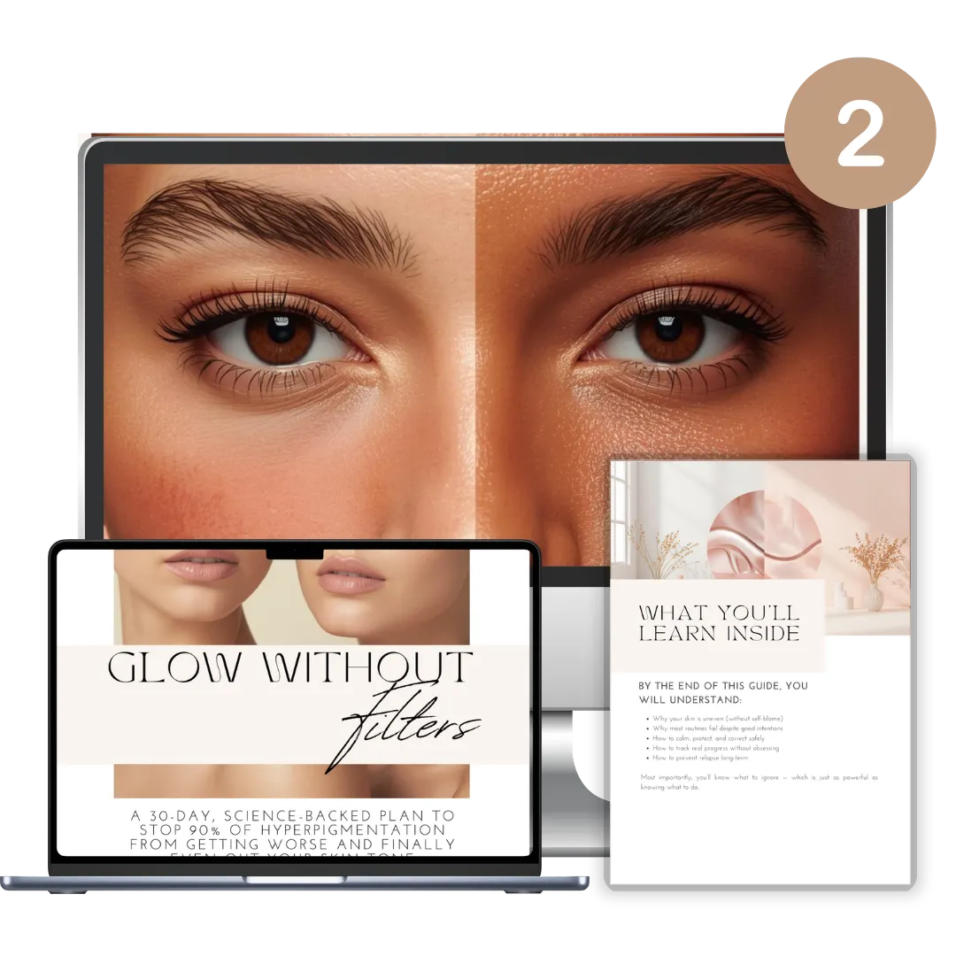 Without bleaching your skin, damaging your barrier, chasing viral routines, or relying on full-coverage makeup just to feel confident. Glow Without Filters is an education-first PDF created for women ages 20–35 who struggle with persistent uneven skin tone and hyperpigmentation, even after months (or years) of consistent skincare.
